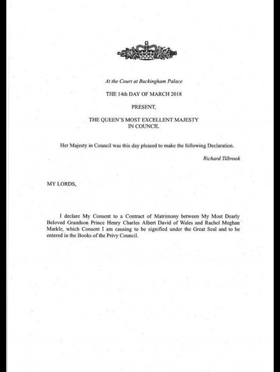გაერთიანებული სამეფოს დედოფალმა ელიზაბეთ II-მ ოფიციალური თანხმობას გასცა პრინც ჰარისა და მეგან მარკლის ქორწილთან დაკავშირებით, რომელიც 19 მაისს შედგება. მისმა უდიდებულესობამ განცხადებით გუშინ მრჩეველთა საბჭოს მიმართა.