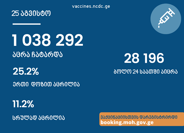 25 აგვისტოს მონაცემებით სულ ჩატარებულია 1 038 292 აცრა. დაავადებათა კონტროლის ეროვნული ცენტრის ინფორმაციით, სულ მცირე 1 დოზით ვაქცინირებულია 719 380 ადამიანი - მოზრდილი მოსახლეობის 25.2%.სრულად ვაქცინ...