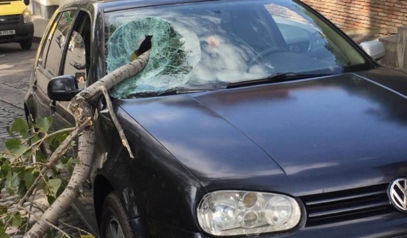 თბილისში ხის ტოტი მოწყდა და მანქანაში შევარდა (ფოტო)