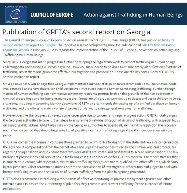 გამოქვეყნდა „ევროპის საბჭოს ადამიანით ვაჭრობის წინააღმდეგ ბრძოლის ექსპერტთა ჯგუფის (GRETA) საქართველოს მეორე შეფასების რაუნდის ანგარიში", რომელშიც საქართველოს შინაგან საქმეთა სამინისტროს მიერ ტრ...