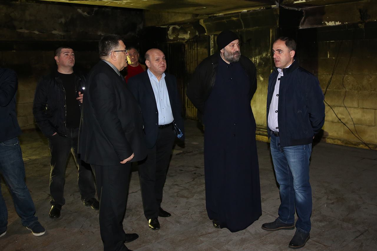 სამების საკათედრო ტაძრის ახალგაზრდულ ცენტრში ხანძრის შედეგად დამწვარი სტამბა ნოდარ ხადურმა და დავით ნარმანიამ დაათვალიერეს