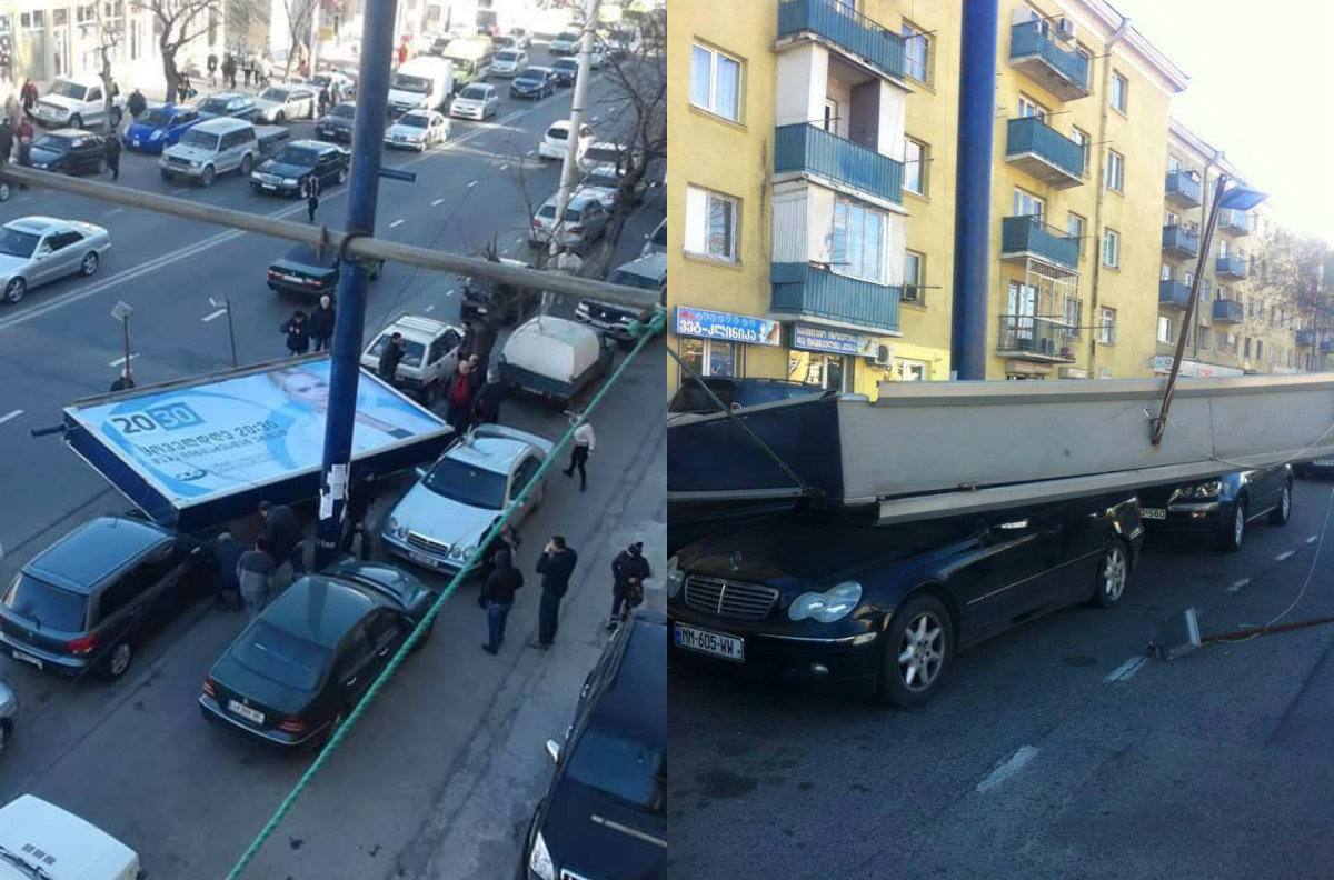 სამგორში 20:30-ის ბანერი ჩამოვარდა და მანქანას დაეცა