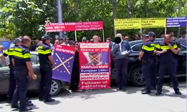 პრორუსულმა, ძალადობრივმა, ჰომოფობიურმა ჯგუფებმა ლიეტუვის საელჩოსთან აქცია გამართეს.