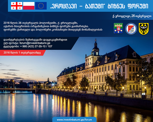 26 თებერვალს პოლონეთის რესპუბლიკაში, ქალაქ ვროცლავში საინვესტიციო ფორუმი „Wroclaw–Batumi“ გაიმართება.
