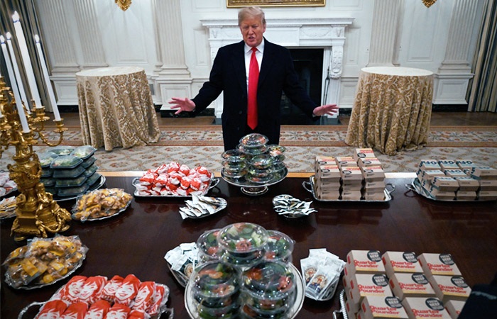 აშშ-ის მთავრობის მუშაობის შეჩერების გამო დონალდ ტრამპი თეთრ სახლში მიწვეულ ფეხბურთელებს ფასტფუდით გაუმასპინძლდა. აშშ-ის პრეზიდენტმა სტუმრებისთვის 300 ჰამბურგერი და კარტოფილის ფრი შეუკვეთა.