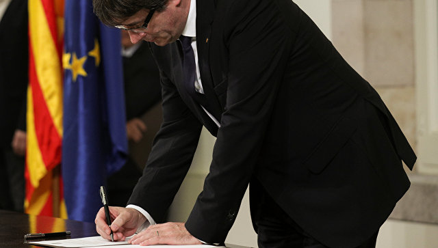 კატალონიის მთავრობის თავმჯდომარემ კარლეს პუჩდემონმა ე.წ. დამოუკიდებლობის დეკლარაციას ხელი მოაწერა. დეკლარაციას ხელი ასევე მოაწერეს პუჩდემონის მოადგილემ ორიოლ ჟუნკარესმა და პარლამენტის სპიკერმა კარმე ფ...