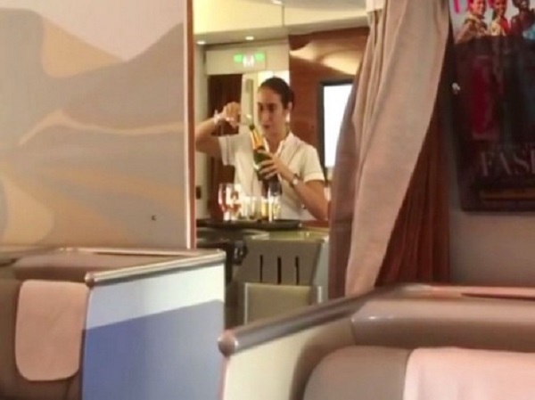 ბიზნეს-კლასის ბორტგამცილებელი მგზავრებს შამპანურის ნარჩენებით უმასპინძლდებოდა (ვიდეო)